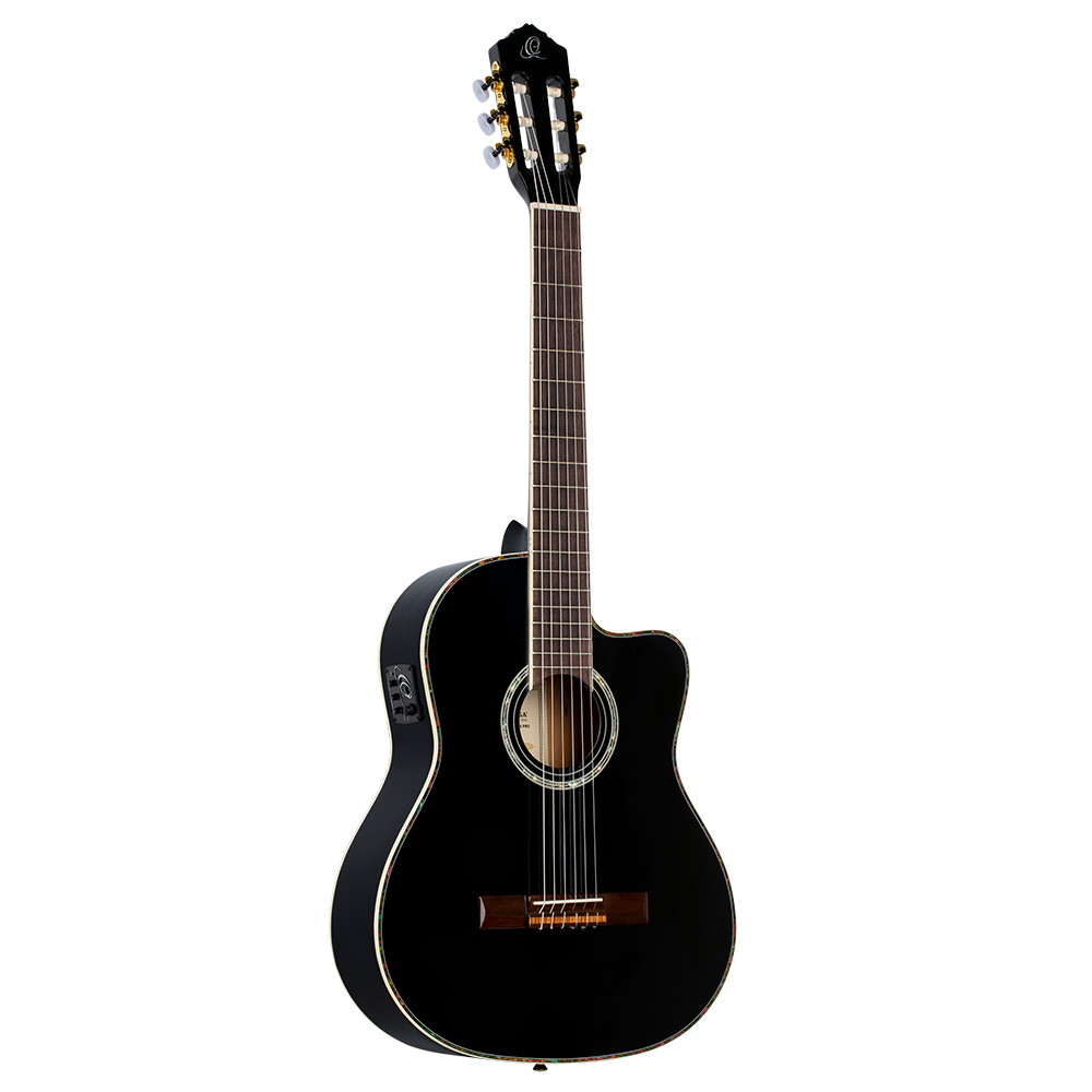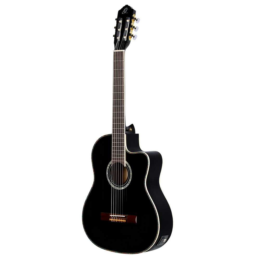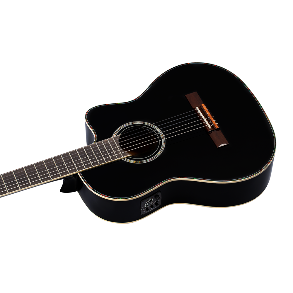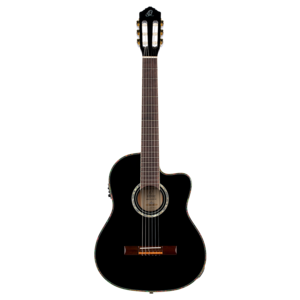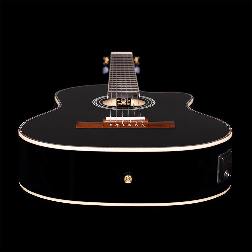 - Solid Canadian Engelmann spruce top, gloss finish black