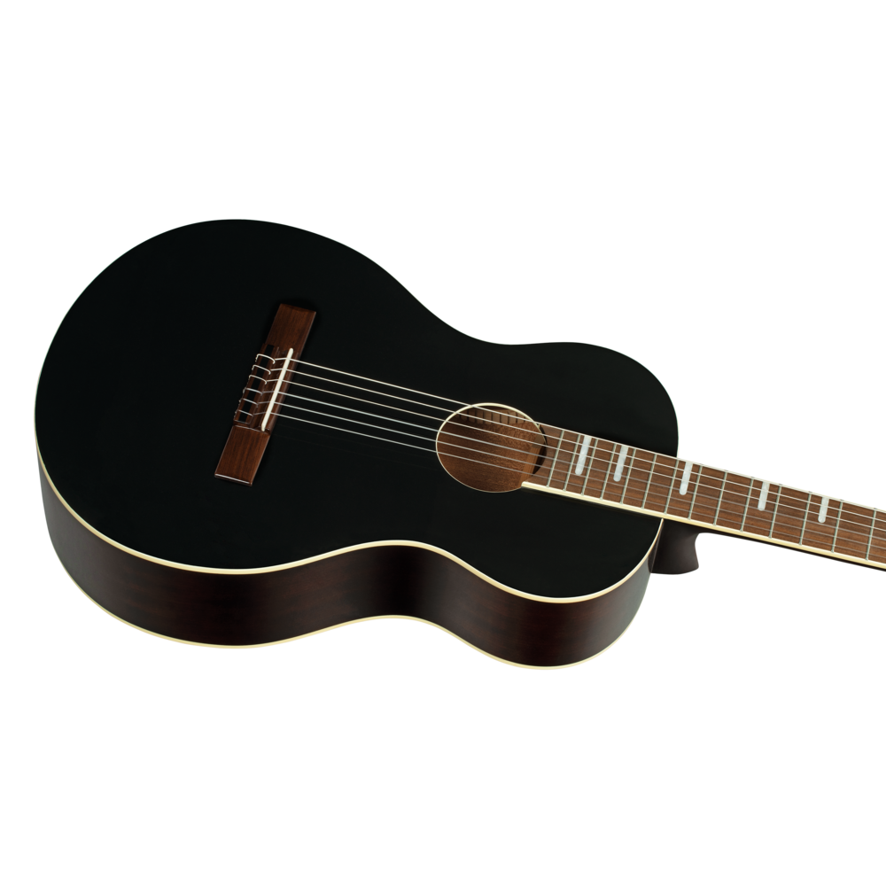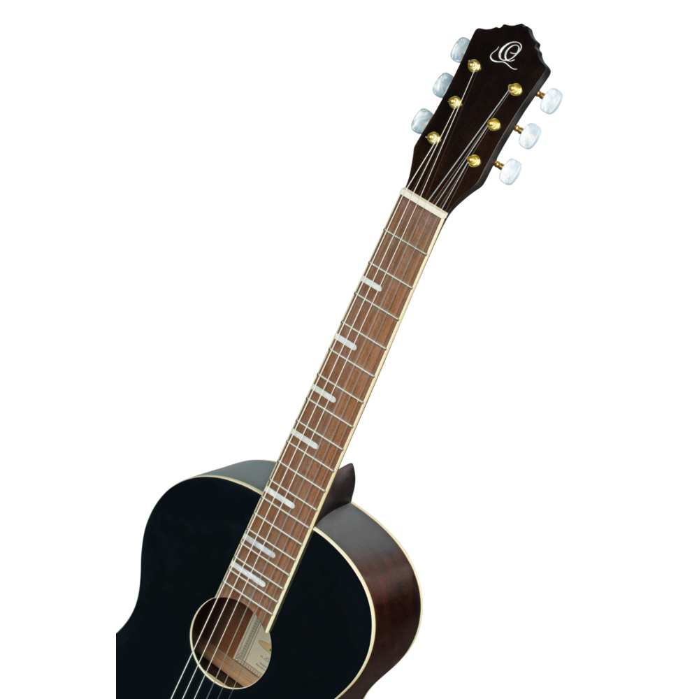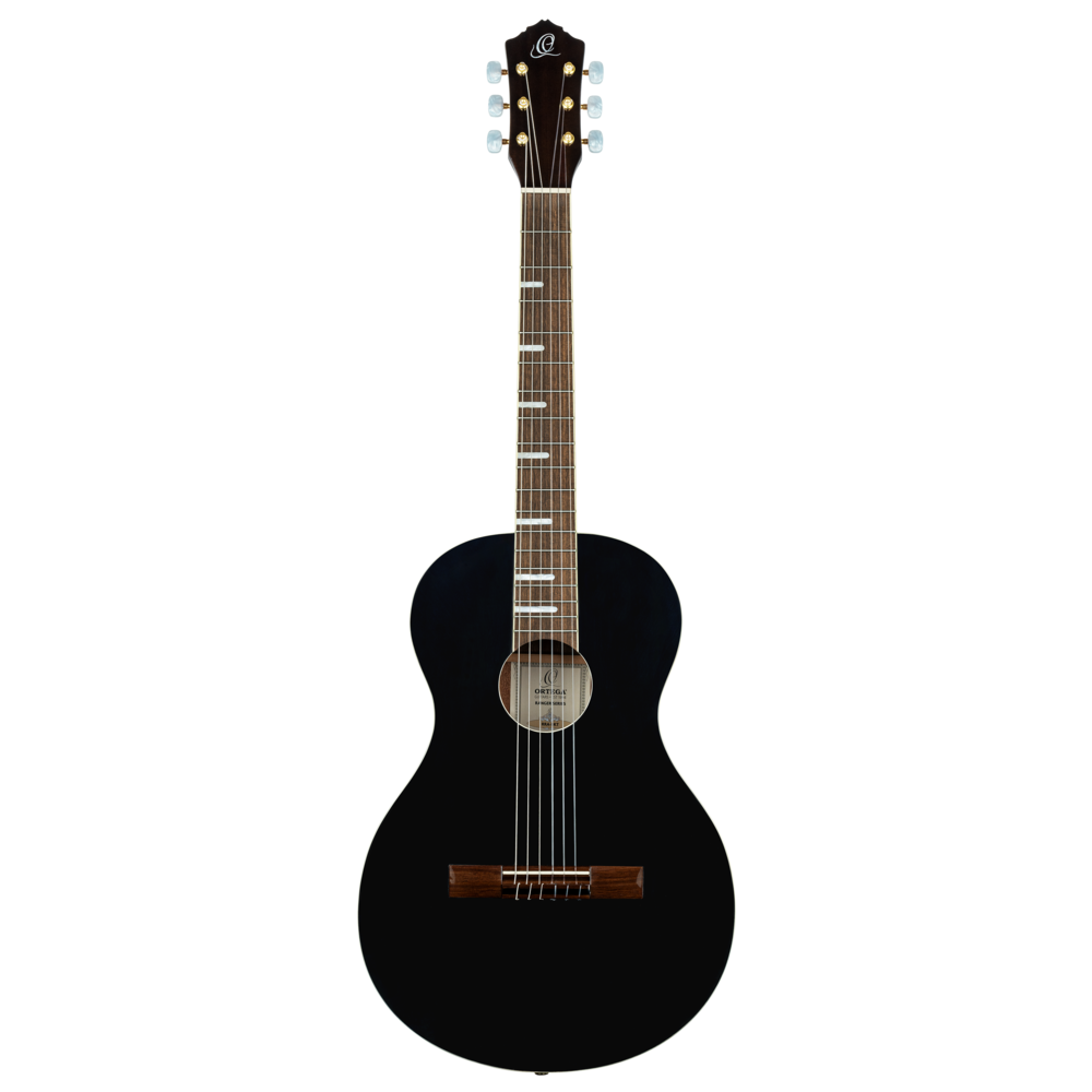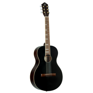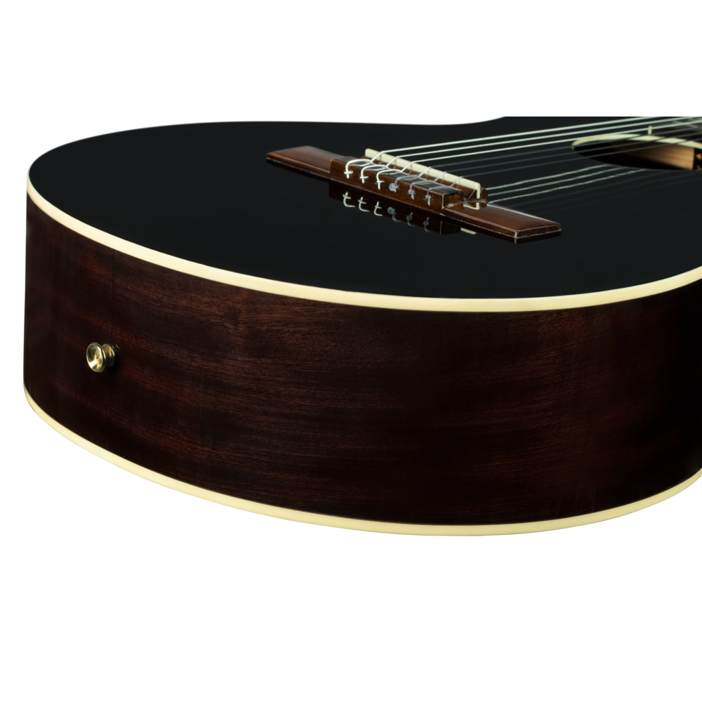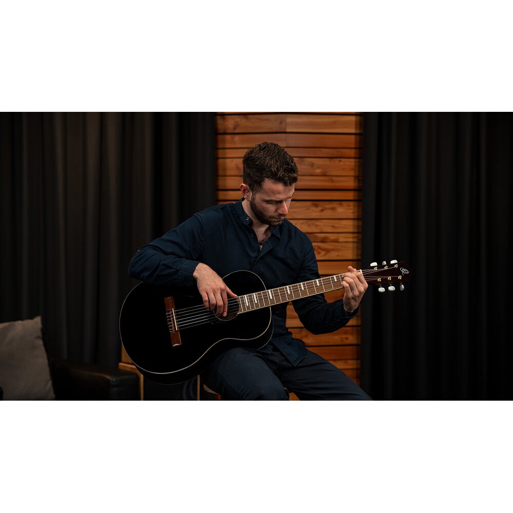 The Ortega Guitars Ranger Series is truly captivating, thanks to its striking glossy top. The colorful tops, available in black, ocean blue, stained red, and platinum, beautifully complement the dark stained mahogany back and sides. The parlor-sized Ranger Series from Ortega features a short-scale neck adorned with bar inlays. Each guitar is also accompanied by a color matching gig bag for added convenience.