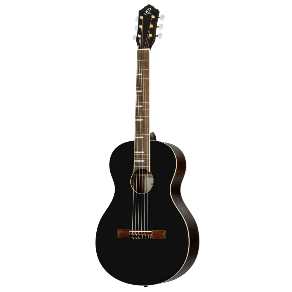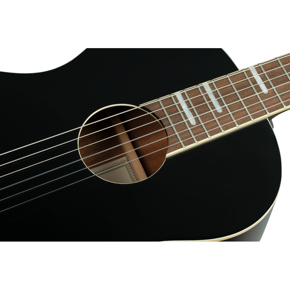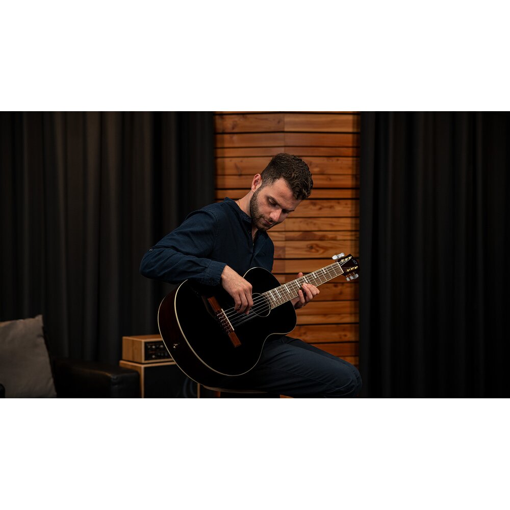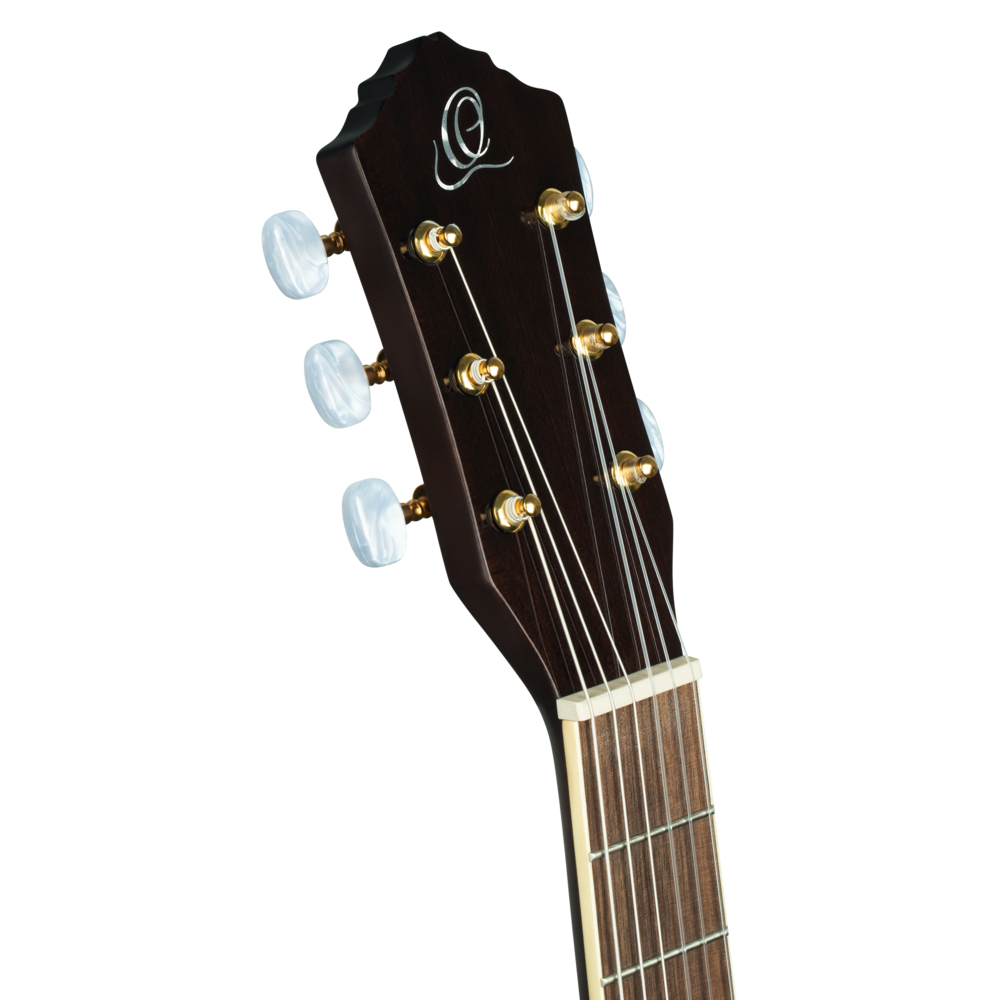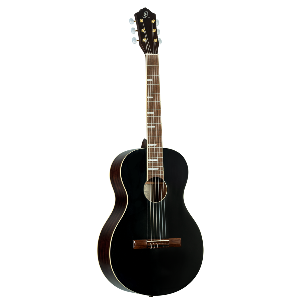 The Ortega Guitars Ranger Series is truly captivating, thanks to its striking glossy top. The colorful tops, available in black, ocean blue, stained red, and platinum, beautifully complement the dark stained mahogany back and sides. The parlor-sized Ranger Series from Ortega features a short-scale neck adorned with bar inlays. Each guitar is also accompanied by a color matching gig bag for added convenience.