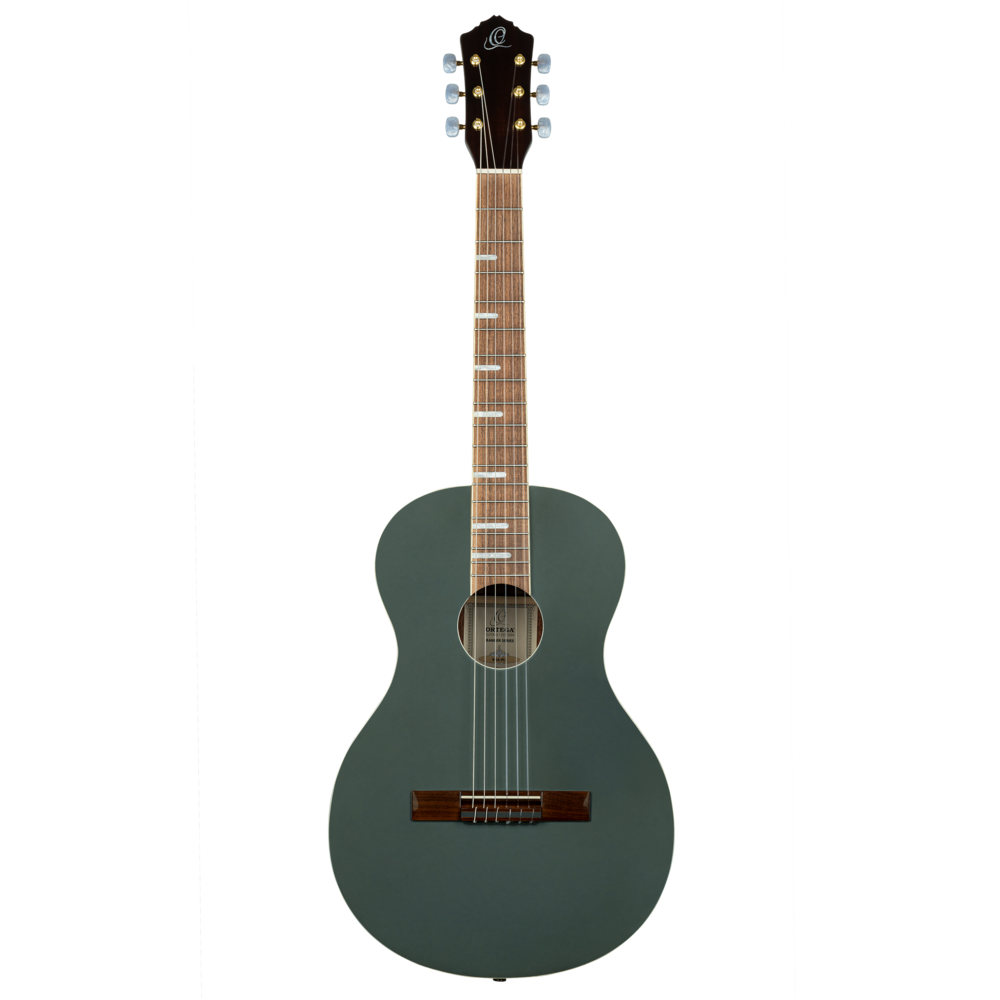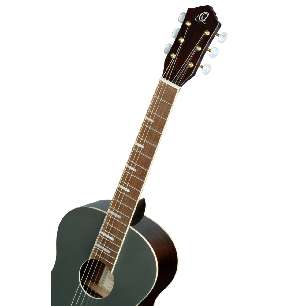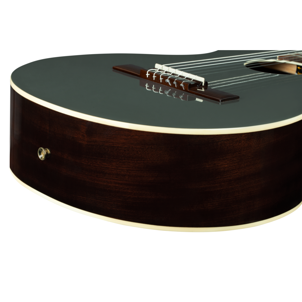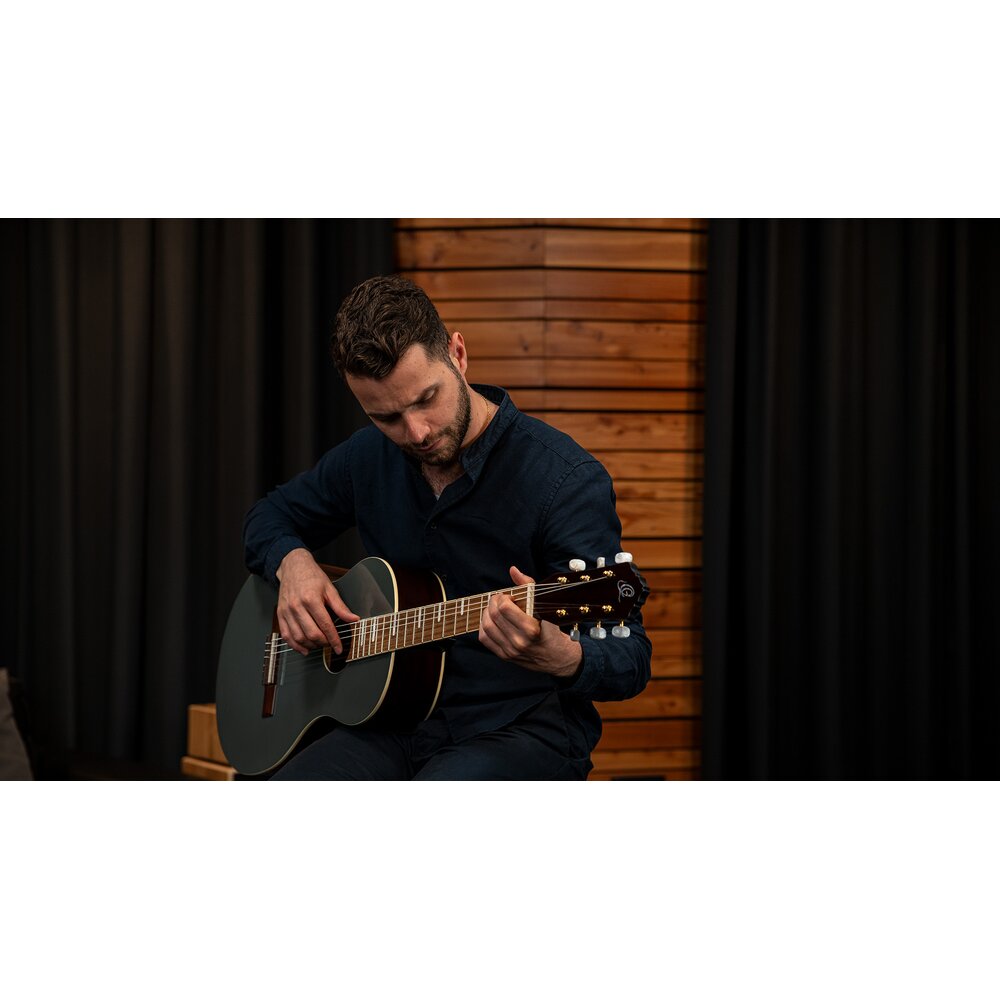 The Ortega Guitars Ranger Series is truly captivating, thanks to its striking glossy top. The colorful tops, available in black, ocean blue, stained red, and platinum, beautifully complement the dark stained mahogany back and sides. The parlor-sized Ranger Series from Ortega features a short-scale neck adorned with bar inlays. Each guitar is also accompanied by a color matching gig bag for added convenience.