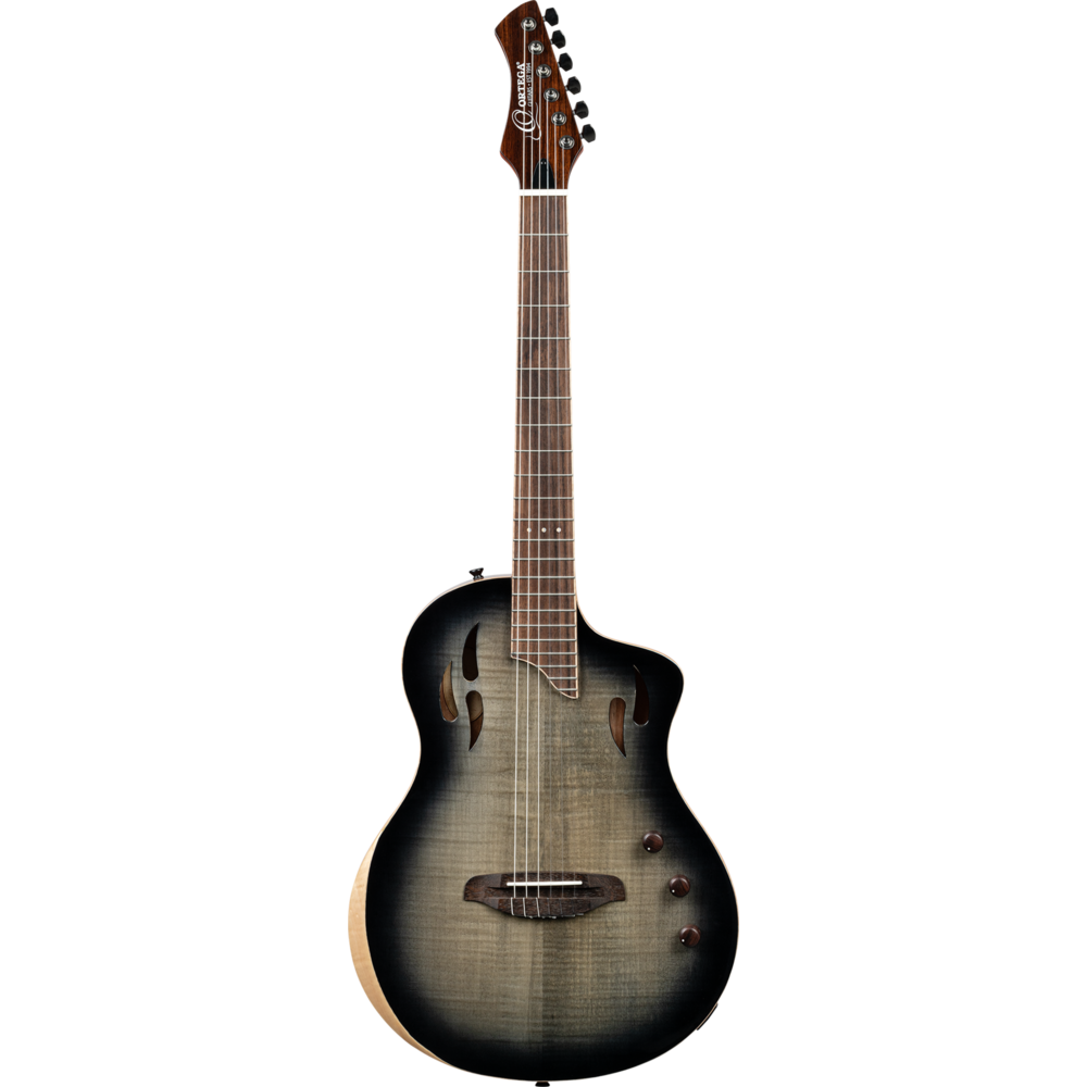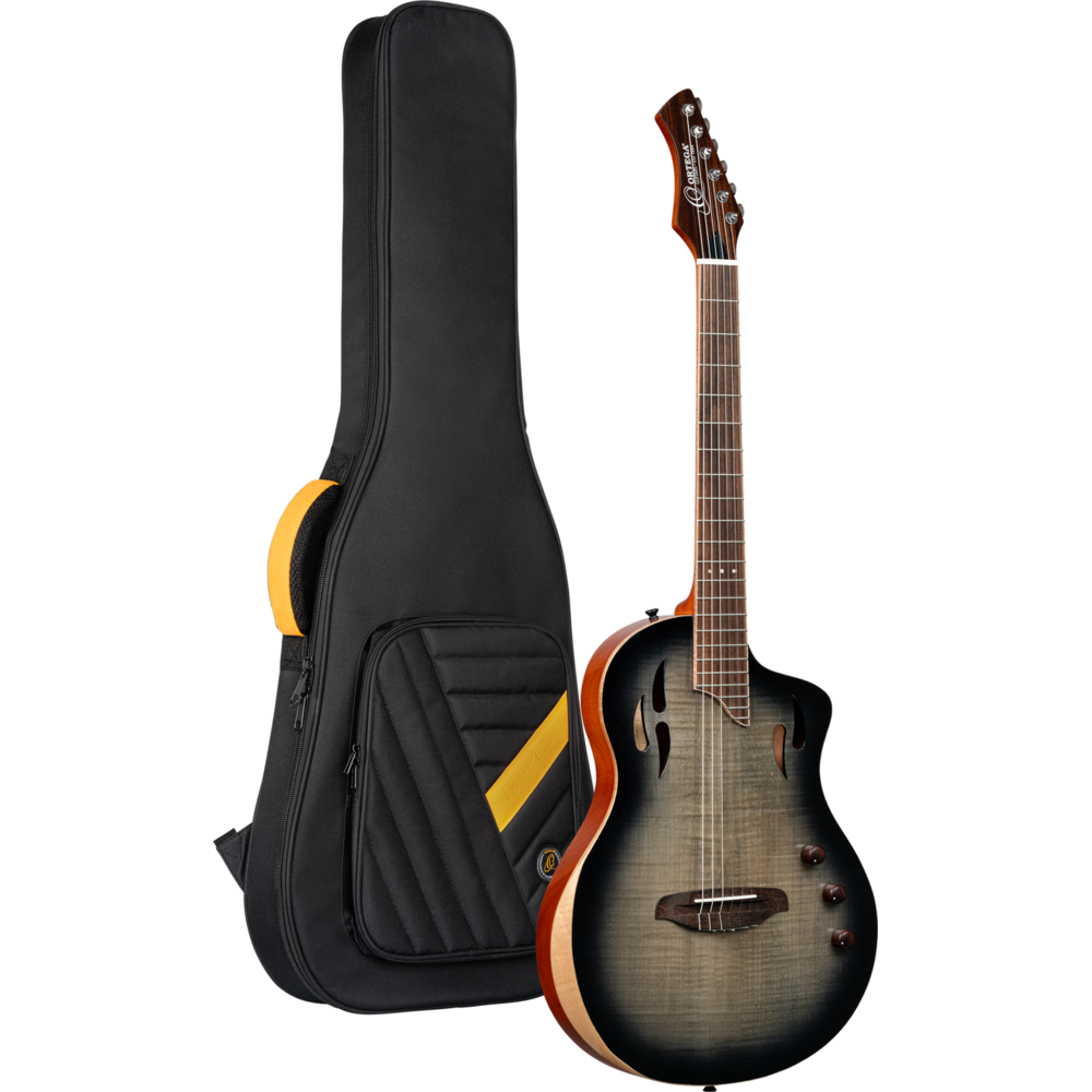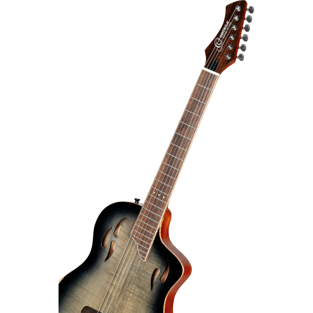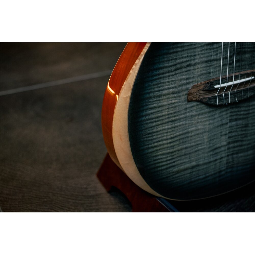 - Solid Spruce top with a Flamed Maple veneer, gloss grey burst finish