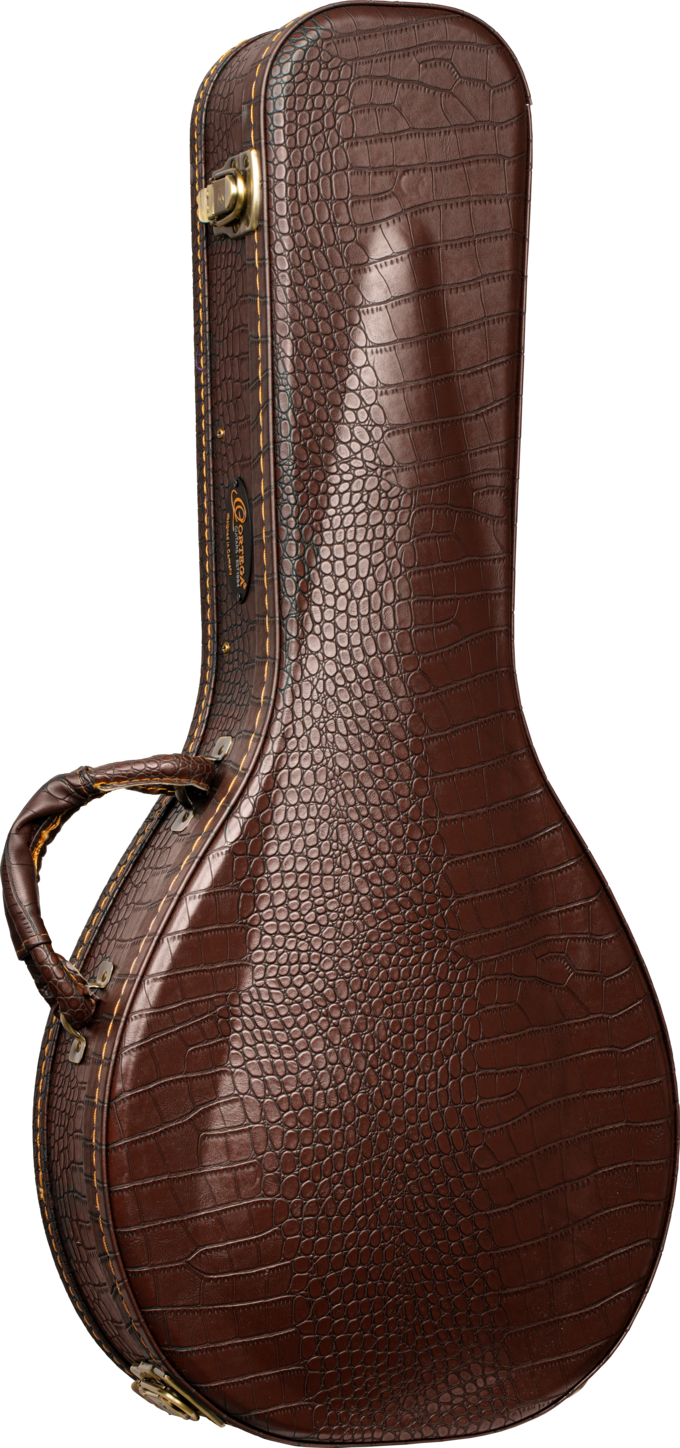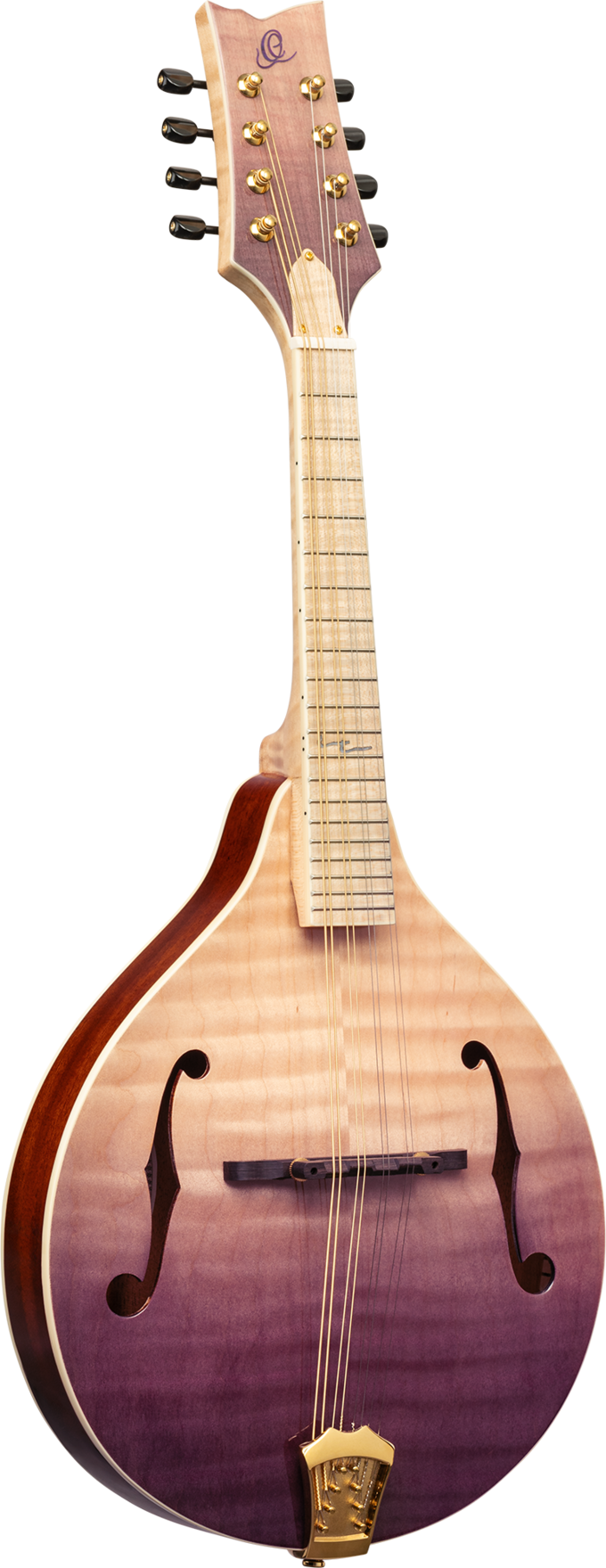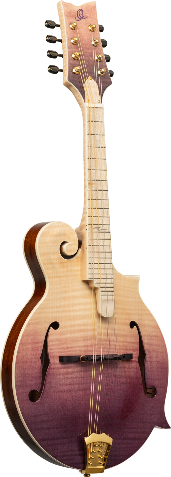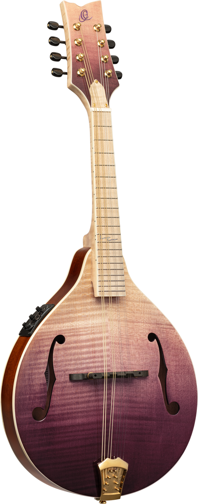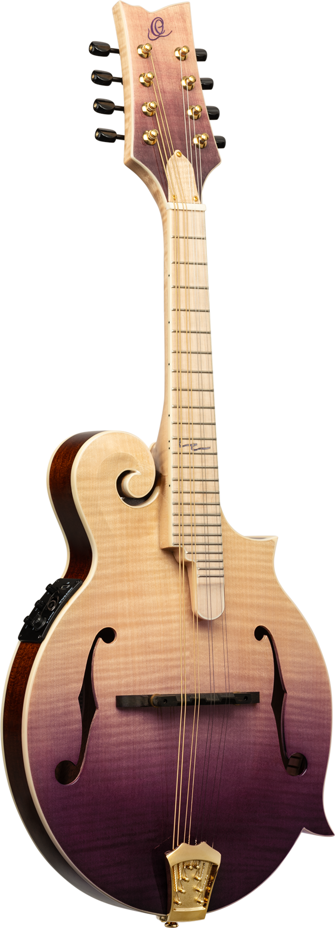 We are proud to introduce four new all solid mandolins. These new models feature an F- or A-style body, an arched solid flamed maple top with a transparent purple fade high-gloss finish, and arched solid mahogany back and sides with a natural high-gloss finish. They are available with or without rechargeable electronics. A crocodile-skin design case with a purple velvet interior is included.
